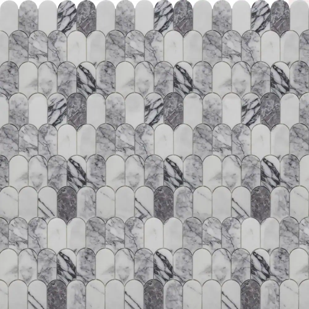 The White & Silver Arched Marble Mosaic showcases a refined fusion of grace and geometry. Composed of elongated arch-shaped tiles in elegant shades of white, grey, and silver-veined marble, this mosaic forms a rhythmic and sophisticated pattern. The gentle curves evoke an Art Deco-inspired allure, while the natural stone texture adds depth and luxury. Perfect for walls, showers, or feature spaces, it brings timeless elegance and serene movement to modern and classic interiors alike.